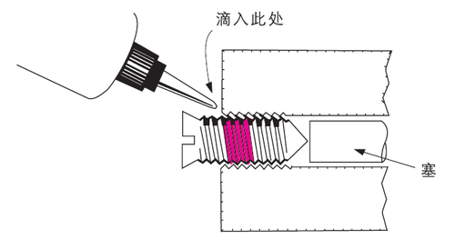 将可调螺钉调整到合适位置。滴几滴快连螺纹锁固剂到螺钉—螺孔结合处。不要让胶瓶的嘴碰到金属,以免污染瓶中的胶液。