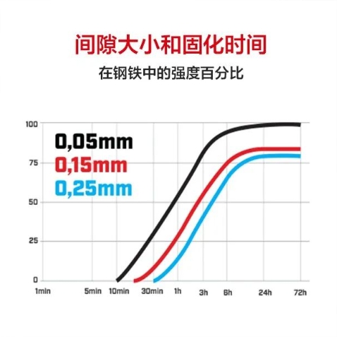 前面提到螺纹锁固胶需要基质表面的金属离子才能有效固化,较大的粘合间隙导致金属离子通过粘合剂扩散较慢。我们不妨看看不同间隙大小和固化时间在钢铁中的强度百分比。