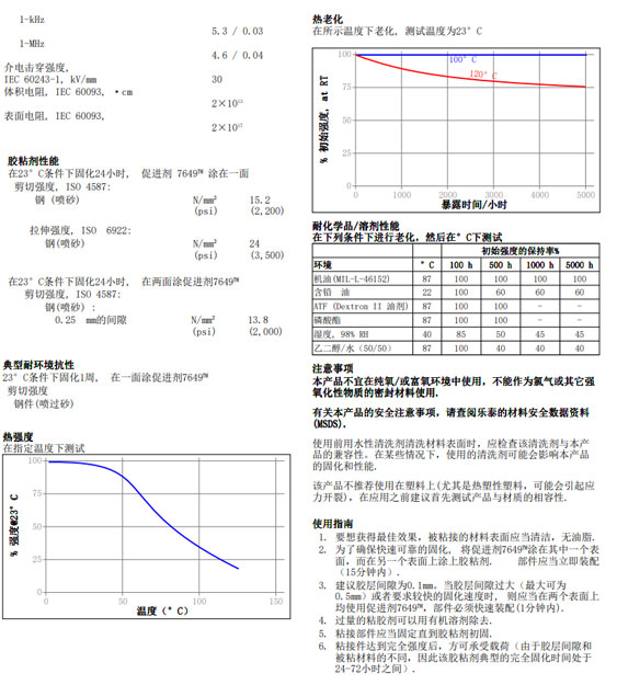 3. 建议胶层间隙为0.1mm。当胶层间隙过大(最大可为0.5mm)或者要求较快的固化速度时, 则应当在两个表面上均使用促进剂7649,部件必须快速装配(1分钟内)。