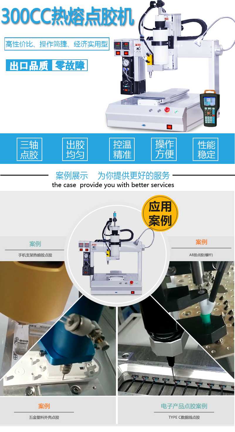 300ml 固科/Glueforce桌面型自动热熔胶点胶机TZ-PUR331R适用于不同生产制造领域,广泛应用于精密五金行,塑胶行业,电子行业,家电行业行业等。适应胶水面广泛,如UV胶、环氧树脂,硅胶,AB胶、黑胶、白胶、PU胶、瞬间胶、红胶、锡膏、散热膏、聚胺脂等。