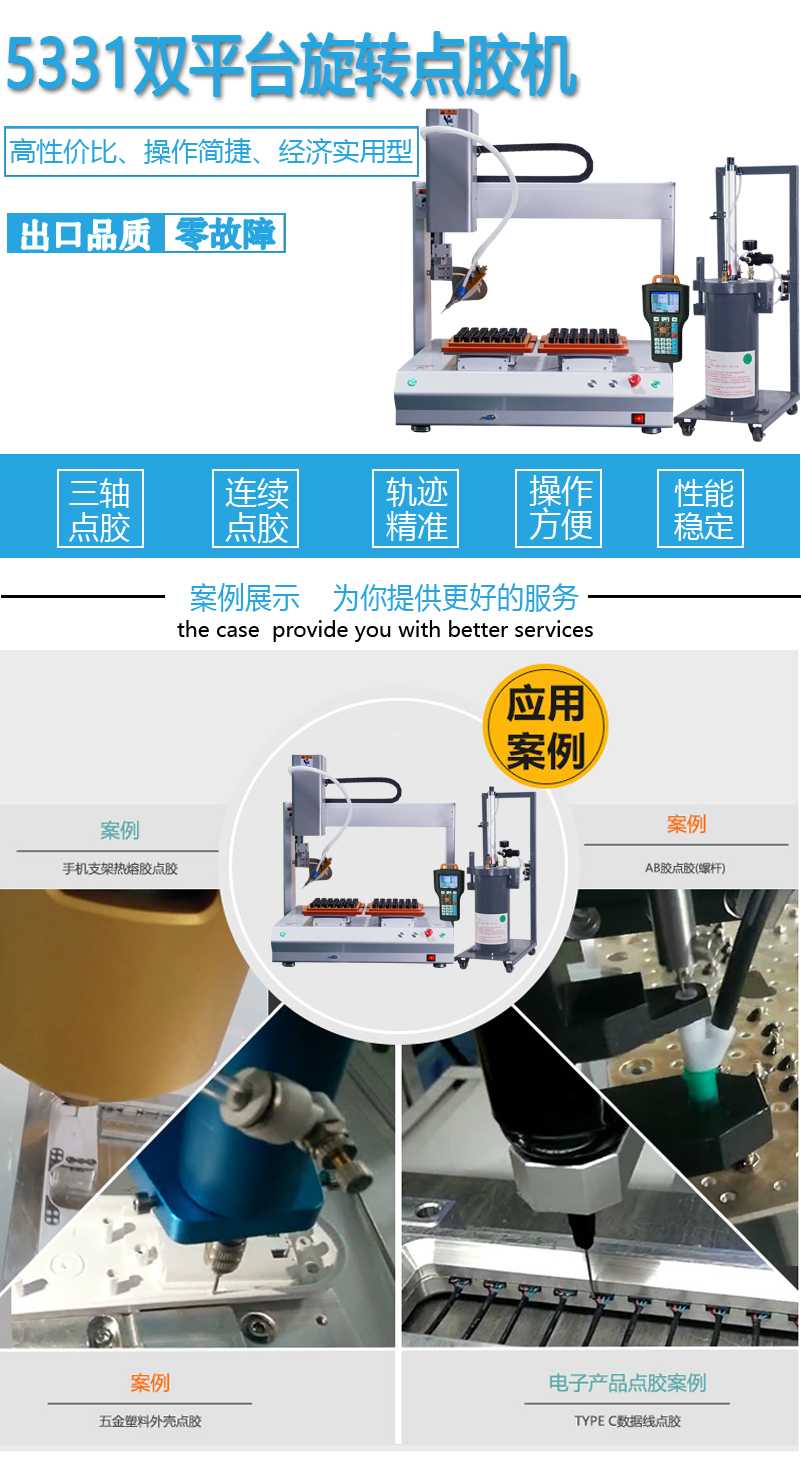 固科/Glueforce双平台自动旋转气动点胶机TZ-DJ5331R-快连适用于工业生产的各个领域:手机按键、开关、连接器、电脑、数码产品、电子玩具、喇叭、蜂鸣器、电子元器件、电路板、LCD液晶屏、继电器、扬声器、晶振元件、LED灯、机壳粘接、光学镜头、机械部件密封.