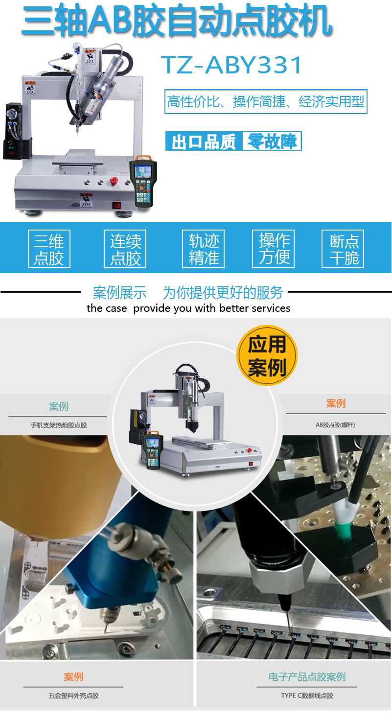 固科/Glueforce三轴桌面型AB胶点胶机 TZ-ABY331适用于不同生产制造领域,广泛应用于精密五金行,塑胶行业,电子行业,家电行业行业等。适应胶水面广泛,如UV胶、环氧树脂,硅胶,AB胶、黑胶、白胶、PU胶、瞬间胶、红胶、锡膏、散热膏、聚胺脂等。