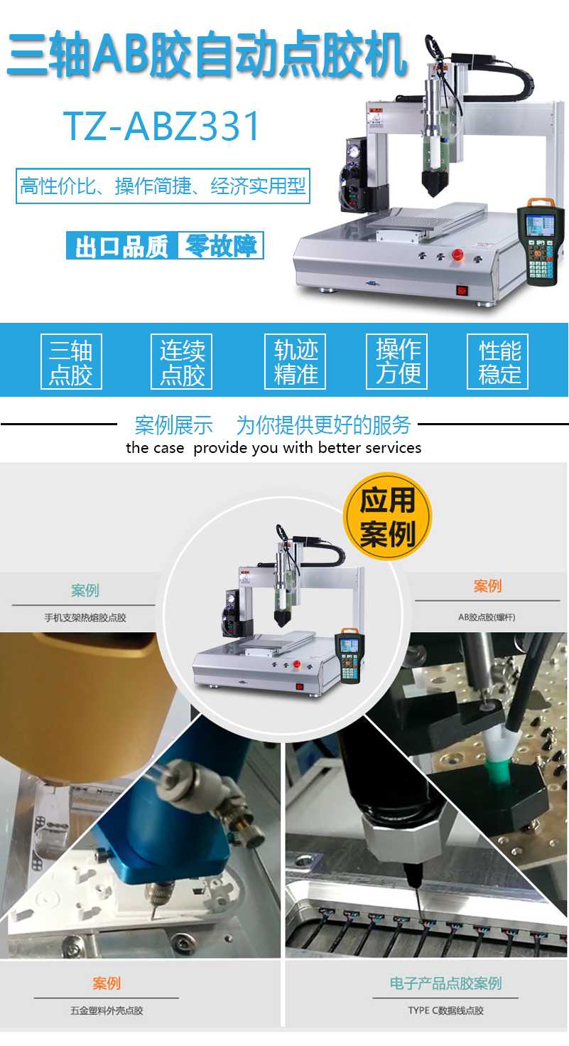 固科/Glueforce三轴桌面型AB胶点胶机 TZ-ABZ331适用于不同生产制造领域,广泛应用于精密五金行,塑胶行业,电子行业,家电行业行业等。适应胶水面广泛,如UV胶、环氧树脂,硅胶,AB胶、黑胶、白胶、PU胶、瞬间胶、红胶、锡膏、散热膏、聚胺脂等。