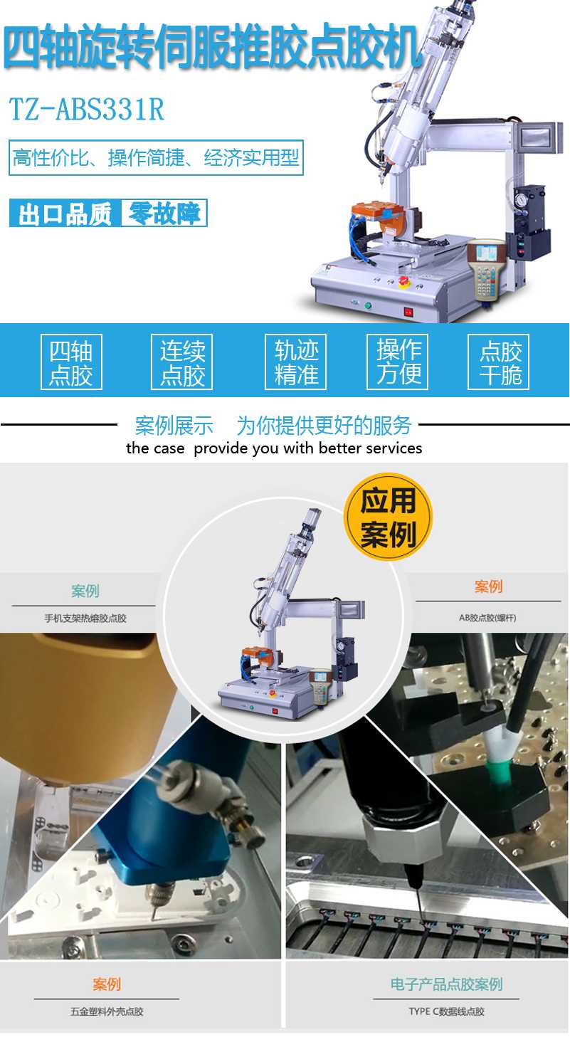 固科/Glueforce四轴旋转伺服AB胶点胶机TZ-ABS331R适用于不同生产制造领域,广泛应用于精密五金行,塑胶行业,电子行业,家电行业行业等。适应胶水面广泛,如UV胶、环氧树脂,硅胶,AB胶、黑胶、白胶、PU胶、瞬间胶、红胶、锡膏、散热膏、聚胺脂等。