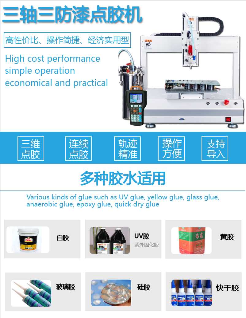 固科/Glueforce三轴三防漆点胶机适用于不同生产制造领域,广泛应用于精密五金行,塑胶行业,电子行业,家电行业行业等。适应胶水面广泛,如UV胶、环氧树脂,硅胶,AB胶、黑胶、白胶、PU胶、瞬间胶、红胶、锡膏、散热膏、聚胺脂等。